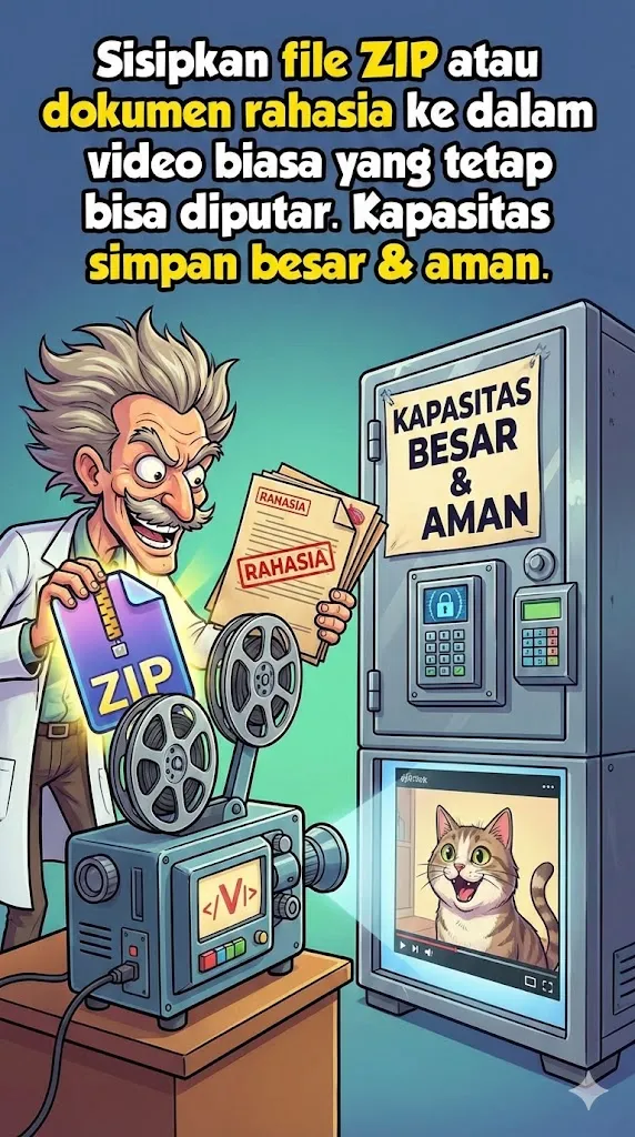 Embed ZIP files or secret documents directly inside an MP4 video. The video plays normally, creating the perfect invisible storage vault for sensitive data.